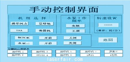 在手動(dòng)界面下可以進(jìn)一步進(jìn)入各個(gè)制冷機(jī)組啟動(dòng)停止操作界面,以及啟動(dòng)停止水泵等,并且可以監(jiān)視印刷機(jī)生產(chǎn)線的狀態(tài)。