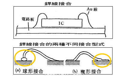 焊線接合首先將芯片固定在合適的基板或?qū)Ь€架(Lead Frame)上,再以細金屬線,將芯片上的電路與基板或?qū)Ь€架上的電路相連接如圖所示。