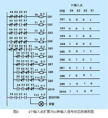 對于直流輸入模塊,采用雙常開按鈕的編程技巧,輸入點可在一定程度上得到擴(kuò)展。例如,利用圖9所示的梯形圖可把4個輸入點擴(kuò)展為10種輸入信號狀態(tài)。圖9中直流輸入模塊的x1、x2、x3、x4均接入常開按鈕,利用這4個按鈕的不同狀態(tài)組合可表示10種輸入信號。如假設(shè)圖9中的第一個邏輯行表示正向起動,第二個邏輯行表示反向起動,第三個邏輯行表示總停止等等。