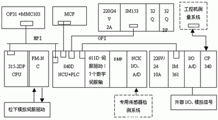 ----MC103界面的二次開發(fā)設(shè)計(jì)。為便于說明,首先介紹一下某專用設(shè)備的情況: 機(jī)床有9個(gè)坐標(biāo)軸、工控機(jī)測量系統(tǒng)、專用傳感器檢測系統(tǒng)、氣動(dòng)真空系統(tǒng)及控制系統(tǒng)840D+FMNC。控制系統(tǒng)的功能是實(shí)現(xiàn)精確位置控制和與各系統(tǒng)間動(dòng)作的邏輯順序控制,使之協(xié)調(diào)一致。 其中: