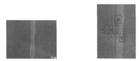 通過(guò)對(duì)大量現(xiàn)場(chǎng)采集的圖像的觀察,可以發(fā)現(xiàn)所有圖像都有同樣的規(guī)律:將Cb作為灰度值時(shí),焊縫本身像素灰度值較高,呈現(xiàn)灰黑色。而焊縫本身像素偏低,呈灰白色。同時(shí)在交界處存在小段過(guò)濾帶。針對(duì)這個(gè)特征,可分別預(yù)先制作2個(gè)小模板。焊縫左邊緣模板a和焊縫右邊緣模板b,如圖4所示。系統(tǒng)對(duì)圖像逐行從左到右掃描。對(duì)各點(diǎn)所在窗口圖像與模板a進(jìn)行匹配。求得匹配相似度,取相似度最大時(shí)所在點(diǎn)x坐標(biāo)為該行的焊縫左邊緣點(diǎn)。于是可得一系列左邊緣點(diǎn),求均值即得到焊縫左邊緣坐標(biāo)。同理,從上到下,由右到左掃描每一行,各點(diǎn)所在窗口圖像與b模塊進(jìn)行匹配運(yùn)算,即可得焊縫右邊緣坐標(biāo)。將左右邊緣坐標(biāo)相加除以2即可得焊縫中心橫坐標(biāo)。