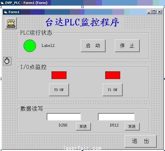 用按鈕控制PLC的起動(dòng)停止,Y0、Y1的ON/OFF及D256、D512寫(xiě)完數(shù)據(jù)的發(fā)送;用Shape組件做指示燈,表示PLC的運(yùn)行狀態(tài)和Y的狀態(tài);用timer組件不停的讀取M1072的狀態(tài),以判斷PLC的運(yùn)行情況;用MScomm控件實(shí)現(xiàn)PC與PLC的通信。