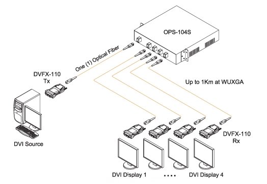 DVI單芯延長器DVFX-110-TR單光纖傳輸距離多模500米單模1000米,光纖接口SC,支持分辨率WUXGA(1920x1200)60Hz,支持EDID讀取,可以配合16路分光器(OPS-116S),使用輸出16路DVI高清信號.