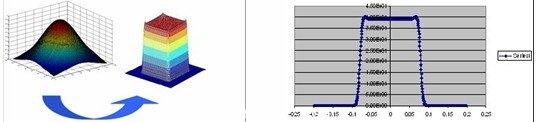 衍射平頂光束整形元件用于將一個(gè)高斯入射光變?yōu)閺?qiáng)度均勻的平頂光束,具有很銳利的邊緣,可以是圓形或方形。主要的應(yīng)用包括激光燒蝕、激光焊接、激光打孔、激光顯示器、激光醫(yī)學(xué)及激光醫(yī)療等。