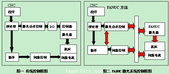 傳統(tǒng)控制方法如圖一所示,CNC程序經(jīng)預(yù)處理以后,激光功率輸出指令與伺服指令分為相互獨立的兩路,分別進行控制。這樣的結(jié)果是,在插補程序段執(zhí)行過程中,如果要穿插激光功率控制,時序上就會不可控。FANUC 激光系統(tǒng)如圖二所示,增加了插補和激光功率控制之間的雙向通信,使得激光功率可以跟插補周期同步控制。如此,在插補程序段中穿插激光功率控制成為現(xiàn)實。
