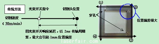 僅僅做到激光功率控制跟插補周期同步,還不足以實現(xiàn)高速飛行。傳統(tǒng)方法因使用I/O控制激光器(如圖一),指令傳輸速度慢。低速飛行加工(≤3m/min)尚可達成,高速加工場合,會因為光束開關(guān)響應(yīng)延遲,引起較大的位置偏差。以切割速度30m/min,數(shù)據(jù)傳輸周期2ms計算,最大會引起的位置偏差: