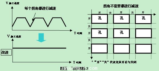 圖五(右)所示,飛行切割進給過程中,速度保持恒定,通過控制光束的開關(guān),分別達到切割與快移的目的。圖五(左)所示V-T曲線可見,因為以長直線線段代替了拐角軌跡,無需加減速,所以保證了恒定高速切割。