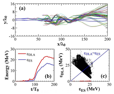 圖4.模擬顯示團簇使DLA機制得以激發(fā),電子從橫向獲得能量和很大波蕩幅度,利于betatron輻射產(chǎn)額的提升