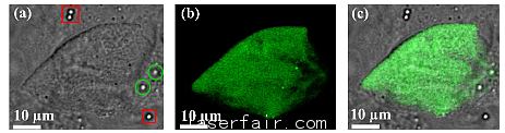 圖a):實驗中一個激光掃描顯微鏡圖下的癌細胞。綠圓圈表示帶涂層的質粒顆粒被光鑷子夾著插入到細胞中。圖b)用熒光顯微鏡觀察的相同細胞。細胞轉染過程中將DNA插入到細胞中,該DNA攜帶綠色熒光蛋白基因編碼。從細胞發(fā)出的綠光可以看出轉染過程是成功的。圖 C)由圖像(B)和(A)疊加形成。