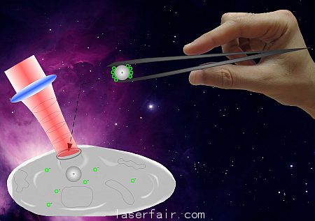 目前,研究活細胞時, 并不能很精確的控制DNA插入到活細胞的力度及時間,有時候在插入一個要研究的目標前不得不毀掉成片的細胞群。認識到這一點后,韓國Gwangju研究所研究出來了一個新的方案---用高功率飛秒激光器精確地在單細胞表面“戳”一個洞,然后再利用另外一個激光器上的電磁場周圍的光鑷輕輕地拉動DNA片段,并將其放入到細胞中。