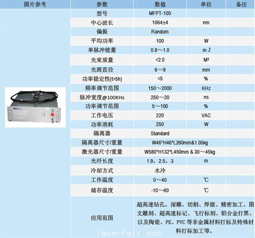 MFPT-100 脈寬可調(diào)MOPA脈沖光纖激光器的工作波長(zhǎng)穩(wěn)定在1064+4nm,功率可調(diào)范圍5%-100%,脈沖寬度可調(diào)范圍20ns-250ns,脈沖重復(fù)頻率150-2000KHz,通過(guò)定制可實(shí)現(xiàn)高達(dá)1mJ的峰值功率輸出,滿(mǎn)足了工業(yè)應(yīng)用的諸多需求,是高重復(fù)頻率、即插即用的高新產(chǎn)品。