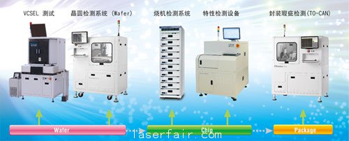 在晶圓(Wafer)檢測部分,致茂結(jié)合Prober-Station與TEC致冷芯片溫控器,可快速制造-40℃到150℃的環(huán)境,并確保在無冷凝的環(huán)境下測試?yán)咨涔怆娞匦噪S溫度變化的情形。于雷射芯片(Chip)檢測段,致茂將使用HOC共用載具(Hand-Over Carrier)的方式可于人員不直接接觸芯片下進(jìn)行自動化光電特性量測L-I-V曲線與燒機(jī)測試的交互測試。而特性檢測Characterization上致茂提供的是Turn-Key解決方案, 整合性的測試可大幅降低人工需求進(jìn)而達(dá)到客戶測試需求;今年致茂也針對TOCAN封裝段的激光器提出新的燒機(jī)檢測系統(tǒng)(Burn-In)與自動化光學(xué)檢測(AOI),可于最終出貨前進(jìn)一步檢測出有瑕疵的激光器。