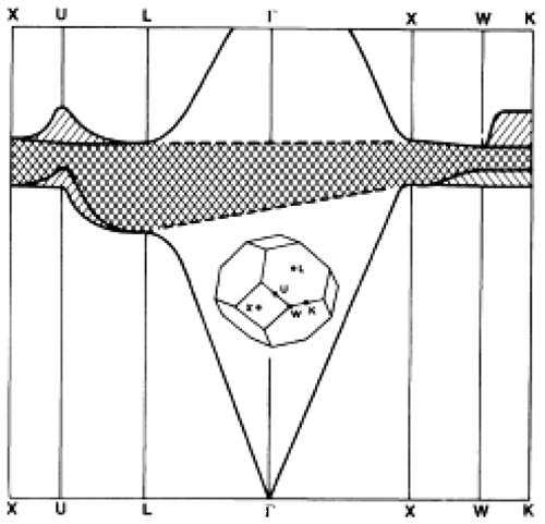 Yablonovitch及Gmitter在實(shí)驗(yàn)中采用的周期性介電系統(tǒng)是在三氧化二鋁(Al2O3 )塊材中,按照面心立方(face-centered cubic, fcc)的排列方式鉆了八千個(gè)球狀空洞,這些空洞即所謂的“原子”,如此形成一個(gè)人造的巨觀晶體。三氧化二鋁和空氣的介電常數(shù)分別為12.5和1.0,面心立方體的晶格常數(shù)是1.27公分。根據(jù)實(shí)驗(yàn)量得的透射頻譜,所對(duì)應(yīng)的三維能帶結(jié)構(gòu)如圖4所示,其中左斜與右斜線分別代表兩種不同的偏極化模。由此圖所求得的絕對(duì)能(absolute gap)位于15GHz的微波范圍,寬度約有1GHz。