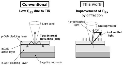 光子晶體與一般LED反射臨界角光子晶體藍(lán)色LED工作原理。