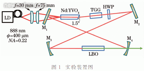 圖1為實驗裝置圖,諧振腔為四鏡環(huán)形腔,其中包含兩個平面鏡[M1:S1,減反(AR)888nm;S2,高透(HT)888nm,高反(HR)1064nm和M2:S1,HR1064nm]和兩個凹面鏡(M3:S1,HR1064nm和M4:S1,HR1064nm,HT532nm;S2,HT532nm。犚M3,M4=100mm)。增益介質(zhì)采用α切割的楔形復合Nd∶YVO4晶體(S1,S2:AR888nm,1064nm),摻雜原子數(shù)分數(shù)為0.8%,尺寸為3mm×3mm×(3+20)mm,對888nm抽運光的吸收效率為89%。楔形晶體的設計可以起到偏振分束器的作用,在不同偏振方向模式的競爭中,保證π偏振光優(yōu)先于σ偏振光在腔內(nèi)起振,提高激光器的線偏振度和偏振方向的穩(wěn)定性。法拉第旋轉器(TGG)和半波片(HWP)組成的光學單向器使激光器實現(xiàn)單向運轉,獲得穩(wěn)定的單頻輸出。倍頻晶體采用尺寸為3mm×3mm×15mm的LBO晶體(S1,S2:AR1064nm,532nm),通過自制的控溫儀(控制精度為0.01℃)將晶體溫度控制為非臨界相位匹配溫度149℃。抽運源采用光纖耦合輸出的激光二極管(LIMOF400DL888EX1458),中心波長為888nm,最大輸出功率為90W,光纖芯徑為400μm,數(shù)值孔徑犖犃為0.22。激光二極管輸出的激光光束經(jīng)傳輸效率為96%的望遠系統(tǒng)整形后聚焦于Nd∶YVO4晶體內(nèi)。
