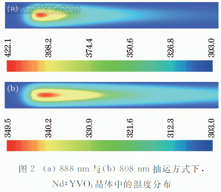 與中心波長為808nm激光二極管抽運相比,采用中心波長為888nm的激光二極管抽運具有兩個優(yōu)點:1)采用888nm直接抽運方式減小了量子虧損產(chǎn)生的熱,例如,要獲得1064nm激光輸出,與808nm抽運相比,熱負荷將從24.1%縮減為16.5%,這樣在激光的抽運過程中,增益介質(zhì)會吸收更多的抽運功率而保證熱負荷不會增加;2)888nm抽運方式無偏振吸收的特性在降低熱效應的同時也改善了激光器工作的穩(wěn)定性。為了定量地描述晶體的熱效應,使用LASCAD軟件分析了888nm和808nm抽運方式在吸收了相同的抽運功率下晶體內(nèi)部的溫度分布。首先,選用摻雜原子數(shù)分數(shù)為0.8%,尺寸為3mm×3mm×(3+20)mm的Nd∶YVO4晶體,該晶體對波長為888nm抽運光的吸收效率為89%。其次,采用摻雜原子數(shù)分數(shù)為0.2%,尺寸為3mm×3mm×(3+20)mm的Nd∶YVO4晶體,當抽運光的波長為808nm時,Nd∶YVO4晶體對抽運光的吸收效率為95%。圖2為在吸收了相同的抽運功率條件下采用兩種抽運方式晶體內(nèi)部在橫向和縱向的溫度分布圖。