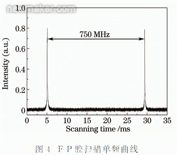 圖4為激光器輸出功率為21.5W時,掃描法布里珀羅(FP)腔得到的單頻曲線,證明激光器實現(xiàn)穩(wěn)定單頻運轉。