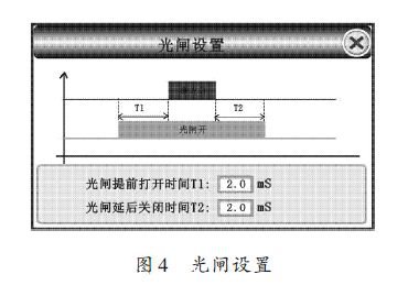 在圖3觸摸屏界面中,點擊“光閘設置”可以進入光閘控制的設置界面,如圖4所示,智能光閘控制,ms級時間內的延遲時間可根據需求定制,保證完全遮光,功能穩(wěn)定,而且操作界面顯示和設置都非常友好方便。