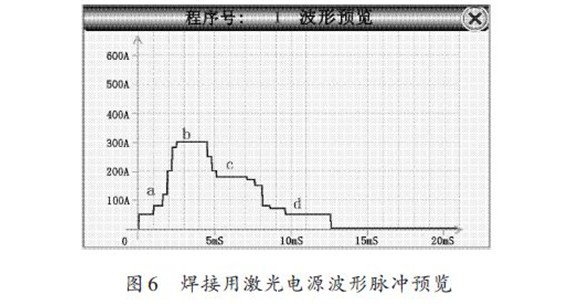 針對以上問題,設計的這款激光電源控制器,可以控制每個打出的激光脈沖的功率,并對單個激光脈沖,進行精確分段,每段設置,保證焊點光滑平整。圖6是針對某種焊接工件給的激光波形預覽。