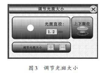 圖3 顯示的是系統(tǒng)搭建完成后液晶控制觸摸屏上顯示調節(jié)光斑直徑的界面。在該界面上通過增、減調節(jié),在上、下限范圍內設置光斑直徑的實際值。內部是通過控制步進電機調整透鏡位置,調整激光焦距,從而使光斑直徑發(fā)生改變。