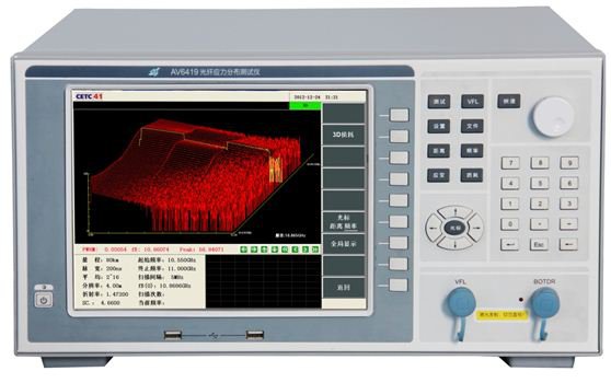 AV6419光纖應(yīng)力分布測(cè)試儀(又稱BOTDR)能夠同時(shí)測(cè)試光纖光纜的應(yīng)力分布、損耗分布及各距離點(diǎn)的布里淵散射譜,具備3D及多種分布參數(shù)同時(shí)顯示功能,具有應(yīng)變測(cè)試精度高、重復(fù)性好及單端無(wú)損測(cè)試等優(yōu)點(diǎn),是光纖通信及光纖傳感領(lǐng)域不可或缺的測(cè)試儀器。