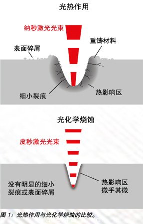 激光去除材料的第二種機制建立在光化學(xué)燒蝕(圖1)基礎(chǔ)上。在這種情況下,激光光子直接破壞目標材料的結(jié)合鍵。這相對來說是一種“冷”加工過程,因而熱影響區(qū)很小。另外,整個加工過程很干凈,沒有重鑄材料,因而很少需要后期再加工。