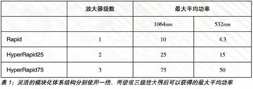 第三種方法是使用半導(dǎo)體泵浦固態(tài)振蕩器,這種方法可以產(chǎn)生更高的脈沖能量。然后是自由空間放大器,通常是再生放大器或多級放大器。事實上,可以使用多個放大器階段來把功率提升到更高水平。例如,Coherent公司2012年收購Lumera Laser公司后獲得的產(chǎn)品就是在Nd:YVO4種子源后加入了一個或多個放大器,使Lumera激光器的脈沖能量高達200μJ(在1064nm)。表1總結(jié)了靈活的模塊化體系結(jié)構(gòu)分別使用一級、兩級或三級放大器后可以獲得的最大平均功率。