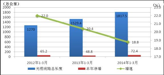 2014年一季度我國新建光纜線路72.4萬公里