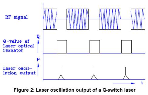 如果激光光學(xué)諧振腔的建成是相對(duì)于0維衍射光(非衍射光), 當(dāng)射頻信號(hào)被感知,衍射光便從激光光學(xué)諧振腔軸線產(chǎn)生. 結(jié)果,激光光學(xué)諧振腔內(nèi)發(fā)生損失,及激光振蕩受到打壓. 利用這一現(xiàn)象, 射頻信號(hào)只在特定某個(gè)時(shí)間長(zhǎng)度內(nèi)被感知,(地位低Q值)來暫停激光振蕩. 在此期間,反轉(zhuǎn)的Nd:YAG激光棒通過連續(xù)泵浦積累了很多. 當(dāng)射頻信號(hào)減至零(地位高Q值)和激光光學(xué)諧振腔內(nèi)的損失消除了, 累積的能量以在極短的時(shí)間長(zhǎng)度內(nèi)脈沖形式的激光振蕩被激活,. 他們是Q開關(guān)脈沖.