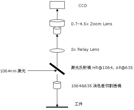 激光1064nm通過兩面拋光的反射鏡折射到下部,經(jīng)過聚焦作用在工件上??梢姽馔ㄟ^反射鏡透射到上部,經(jīng)過relay透鏡將工件聚焦,經(jīng)過一個CCD的可調(diào)物鏡將工件成像在CCD的焦面上。