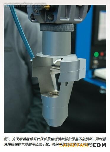 一個重要的硬件開發(fā)成果是一種新的帶有交叉噴嘴設(shè)計的聚焦透鏡組,它可以確保Laserdyne第三代Beam Director系統(tǒng)(稱為BD3Y)具有緊湊的外形。交叉噴嘴的設(shè)計可以提供一種高流速的氣體屏障,以防止焊接區(qū)域的金屬火花污染透鏡的防護滑蓋。這一設(shè)計的關(guān)鍵在于交叉噴嘴也能避免焊接保護氣體的污染或干擾。交叉噴嘴可以影響到完整的保護氣體送氣設(shè)備,包括焊接同軸氣體噴嘴尖端(圖3)。