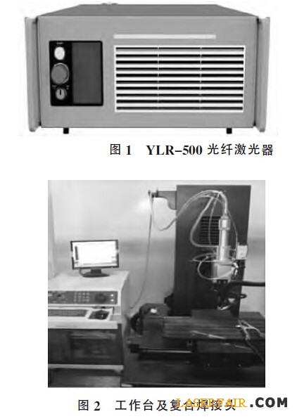 試驗采用德國IPG 公司生產(chǎn)的YLR-500 單模光纖激光器,如圖1 所示,激光功率500 W,TIG焊接機(jī)采用日本松下TIG 焊機(jī),并使用自制的激光-TIG復(fù)合焊頭及三維工作平臺進(jìn)行焊接試驗,工作臺及復(fù)合焊頭如圖2 所示。