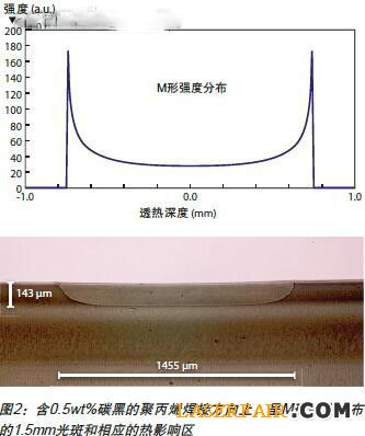 對(duì)輪廓焊接和準(zhǔn)同步焊接來說,M形光斑強(qiáng)度的分布更為方便。顧名思義,M形強(qiáng)度分布的圓形平頂光束成像在工件上的光斑在邊緣的強(qiáng)度要高于中間位置。這就能確保焊接過程中沿著焊縫方向的溫度分布均勻。圖2顯示了含有0.5wt%碳黑的聚丙烯中的M形強(qiáng)度分布的光斑和相應(yīng)的熱影響區(qū)。這里的透熱深度是指沿著光束引導(dǎo)方向上的透熱深度。