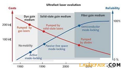 圖1  超快激光器演變過程,從最初的染料激光器到最近的固態(tài)和光纖激光器