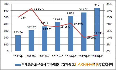 2012---2018年全球光纖激光器器件市場規(guī)模(單位:百萬美元)