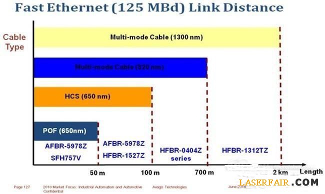 雖然銅電纜和光纖都可以作為傳輸媒介,但光纖解決方案為系統(tǒng)設(shè)計工程師提供了許多明顯的好處,相較于銅電纜解決方案,通過塑料光纖(POF, Plastic Optical Fiber)或較長距離時硬包層石英(HCS, Hard Clad Silica)光纖運行的工業(yè)用快速以太網(wǎng)(Fast Ethernet)有許多優(yōu)勢,采用銅電纜的通信鏈路容易受到電磁場的干擾,并且也會發(fā)出可能干擾其他設(shè)備的電磁波,而光纖鏈路則不會受到電磁場影響,也不會產(chǎn)生任何電磁干擾(EMI, Electro Magnetic Interference)。