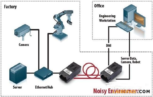 由于光纖鏈路媒介基本上采用玻璃或塑膠,因此在絕緣和隔離特性上遠比常見的銅電纜優(yōu)秀許多,原因是它們不會受到EMI的干擾,如圖2中以紅色標示的5米長POF或100米長HCS光纖就提供了高噪聲環(huán)境下相對于銅電纜線的許多優(yōu)勢。采用光纖解決方案,在光纖本身或者是光纖和銅電纜間不會有相互干擾問題,使得數(shù)據(jù)傳輸更加安全。光纖對于閃電電擊有較高的耐受力,并且有助于消除接地環(huán)路所造成的錯誤,在面臨惡劣條件或可能暴露的環(huán)境時,適當使用光纖解決方案可以藉由通過降低閃電電擊可能帶來的損害以及電氣火花造成的沖擊而提高安全性。