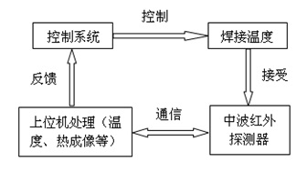 通過中波紅外探測器探測激光焊接溫度的熱輻射能,將數(shù)據(jù)信息傳給上位機(jī)進(jìn)行一系列處理,處理后的溫度信息反饋給下位機(jī)控制系統(tǒng),由控制系統(tǒng)調(diào)節(jié)激光輸出功率,控制激光焊接溫度。