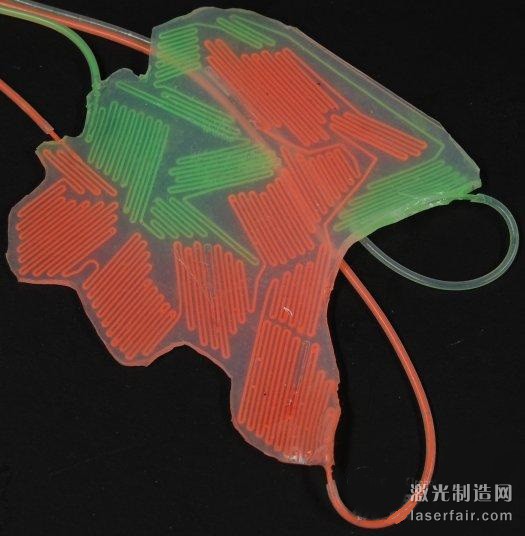 研究過程中,研究人員使用了微流體技術(shù),在軟體機器人體內(nèi)嵌入微型管道,之后再往管道內(nèi)注入多種熒光材料。由于只需在機器人體內(nèi)安裝少量的微型管道就能夠產(chǎn)生變色效果,因此機器人的自身重量仍保持在較低水平。