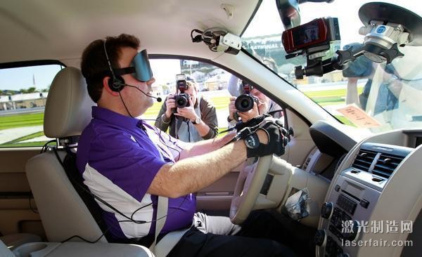 盲人汽車上安裝的導(dǎo)航裝置是激光傳感器和照相機(jī),汽車通過(guò)傳感器向計(jì)算機(jī)發(fā)送數(shù)據(jù),而后,計(jì)算機(jī)就會(huì)根據(jù)這些數(shù)據(jù)通過(guò)手套向駕駛者及時(shí)發(fā)送方向等信息。