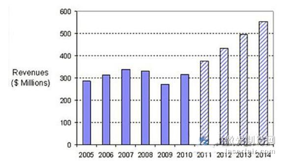 圖1 功率在1kW以下各種中紅外激光器的市場(chǎng)營(yíng)業(yè)收入
