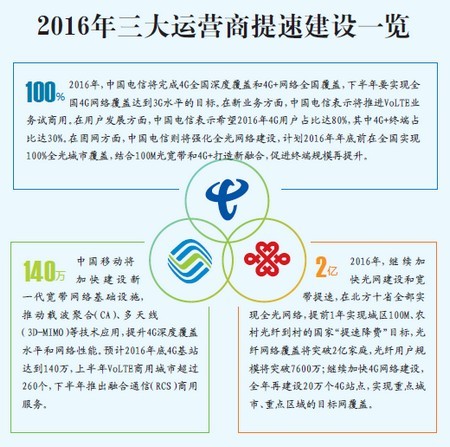 根據(jù)三大運(yùn)營商各家的2016年的規(guī)劃,高速光纖寬帶網(wǎng)絡(luò)和4G+是有線端和無線端的兩個投資重點。
