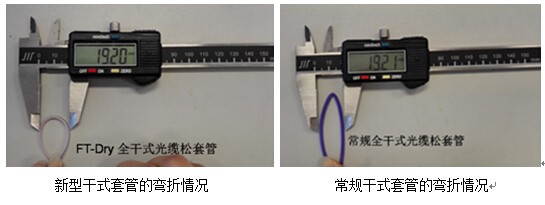 除了上述優(yōu)點,我們開發(fā)的FT-Dry全干式光纜比一般的光纜更為柔軟,尤其是套管有著更好的抗彎折性能,其最小彎曲半徑小于10mm,可直接在接頭盒中盤繞而不會彎折,能很好地滿足客戶在接續(xù)操作中對這方面的較高要求。
