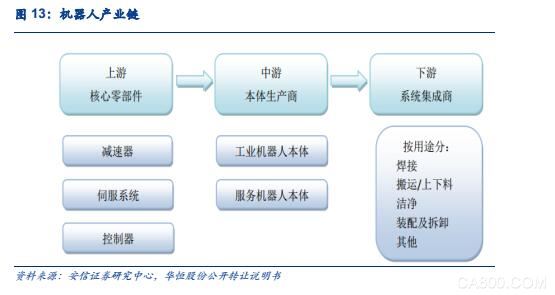 機器人自動化行業(yè)按產(chǎn)業(yè)鏈分為上游、中游和下游。上游生產(chǎn)核心零部件:包括減速器、伺服系統(tǒng)、控制器;中游是本體生產(chǎn)商,包括工業(yè)機器人本體、服務(wù)機器人本體。下游是系統(tǒng)集成商,包括單項系統(tǒng)集成商、綜合系統(tǒng)集成商。