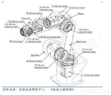 工業(yè)機器人具備在高危環(huán)境下生產(chǎn)、生產(chǎn)效率高、穩(wěn)定性強、精度高等特點,它是通過編程或示教方式實現(xiàn)自動化,同時具備擬人形態(tài)及功能的裝臵,主要由本體、伺服電機、減速機、控制器、傳感器等核心零部件構(gòu)成,操作系統(tǒng)包括伺服系統(tǒng)、控制系統(tǒng)、視覺系統(tǒng)等。