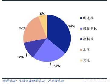 工業(yè)機器人優(yōu)于傳統(tǒng)的機械設(shè)備的原因主要在于上游的關(guān)鍵基礎(chǔ)部件。從結(jié)構(gòu)上來看,工業(yè)機器人由控制系統(tǒng)、驅(qū)動系統(tǒng)和執(zhí)行機構(gòu)組成,分別對應(yīng)控制器、伺服電機和減速器等核心零部件。從成本上來看,核心零部件占工業(yè)機器人成本大頭,約72%左右。多軸工業(yè)機器人的成本構(gòu)成中,機械本體約占22%;伺服系統(tǒng)約占24%;減速器系統(tǒng)約占36%;控制系統(tǒng)約占12%;其他外設(shè)約占6%。