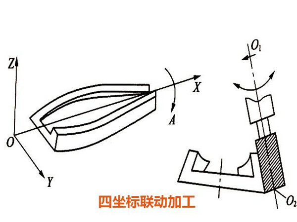 ③四坐標(biāo)聯(lián)動(dòng)加工。所示的飛機(jī)大梁其加工表面是直紋扭曲面若用三坐標(biāo)聯(lián)動(dòng)機(jī)床和球頭銑刀加工,不但生產(chǎn)率低,而且零件表面的表面粗糙度也很差。以采用圓柱銑刀周邊切削方式,在四坐標(biāo)機(jī)床上加工,除三個(gè)移動(dòng)坐標(biāo)的聯(lián)動(dòng)外,為保刀具與工件型面在全長(zhǎng)上始終貼合,刀具還應(yīng)繞O1(或O2)做擺動(dòng)聯(lián)動(dòng)。此擺動(dòng)聯(lián)動(dòng)導(dǎo)致直線(xiàn)移動(dòng)坐標(biāo)要有附加的補(bǔ)償移動(dòng),其附加運(yùn)動(dòng)量與擺心的位置有關(guān),也需在編程時(shí)進(jìn)行計(jì)算。加工程序要決定四個(gè)坐標(biāo)軸的位移指令,以控制四軸聯(lián)動(dòng)加工,因此編程相當(dāng)復(fù)雜的。