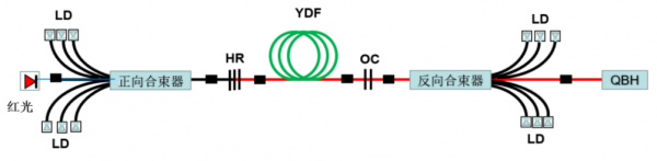諧振腔結構光纖激光器原理:通過前向和后向的合束器,將泵浦半導體激光器LD的功率經(jīng)過光纖光柵(高發(fā)光柵HR、低反光柵OC)注入到摻鐿雙包層光纖(YDF)中。YDF中稀土離子吸收泵光后,形成粒子數(shù)反轉分布,產生自發(fā)輻射光,然后在光纖光柵對(HR-OC)的作用下形成受激輻射光放大產生激光,并經(jīng)過OC和輸出光纜QBH輸出出來。