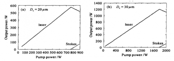 正向抽運下 , 當纖芯直徑一定(20μm),隨著光纖長度的增加,SRS的閾值會急劇降低。通過減小光纖長度, 可以得到較高的輸出功率。