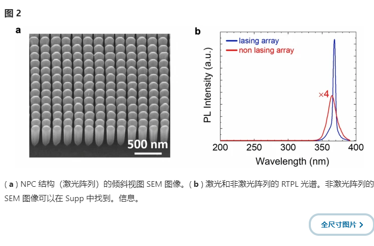進一步注意到,在這項研究中,與從頂部收集的激光強度相比,從側(cè)面收集的激光強度僅為 ~ 1/30,表明表面主導(dǎo)光發(fā)射。詳細討論可以在補充中找到。信息。文本S3。在這項研究中,我們還測量了 GaN-on-sapphire 模板和帶有 Ti 掩模的 GaN-on-sapphire 的 PL 光譜。結(jié)果在補充中描述。信息。文字S4. 簡而言之,僅從具有 Ti 掩模的藍寶石上 GaN 測量到弱 PL,這表明從非激光陣列和激光陣列測量的光發(fā)射來自頂部生長的 GaN 納米線。這也證實了激射是由于NPC發(fā)出的光。還注意到,由于激光陣列和非激光陣列具有相同的高度,因此排除了激光是由于法布里-珀羅(FP)腔的形成。